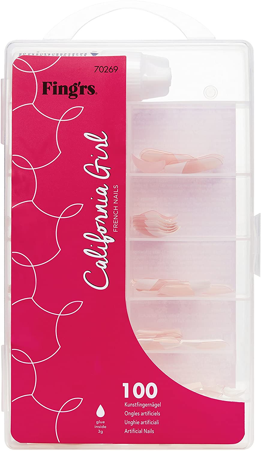 - Doigt French Kit Faux Ongles : 100 capsules auto-adhésives, accompagnées d’une colle, idéales pour une french manucure express. Prix indicatif : 5€.
