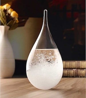 Le verre Tempête (36,95 EUR chez Front Gardiste) intrigue par sa capacité à prédire la météo : cristaux visibles pour un temps humide, brume pour l’orage, verre clair pour le beau temps. Un objet fascinant, entre science et poésie.